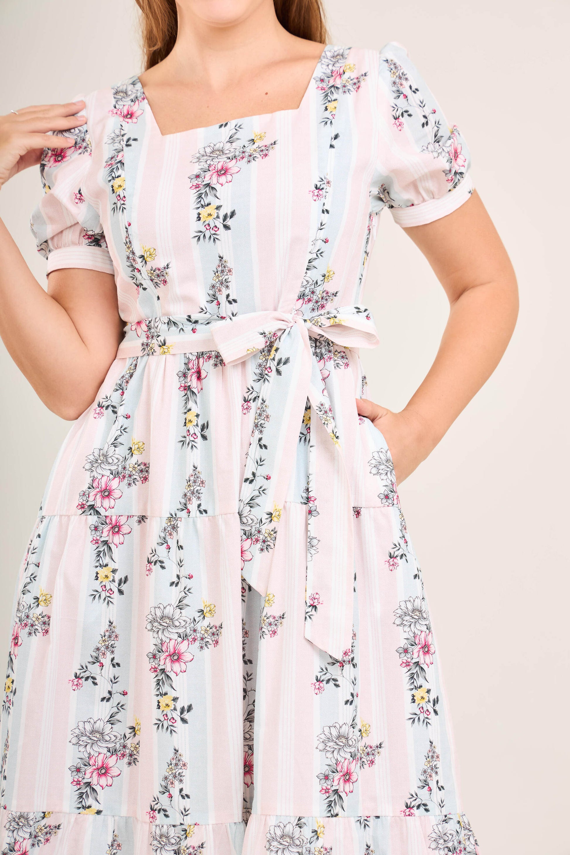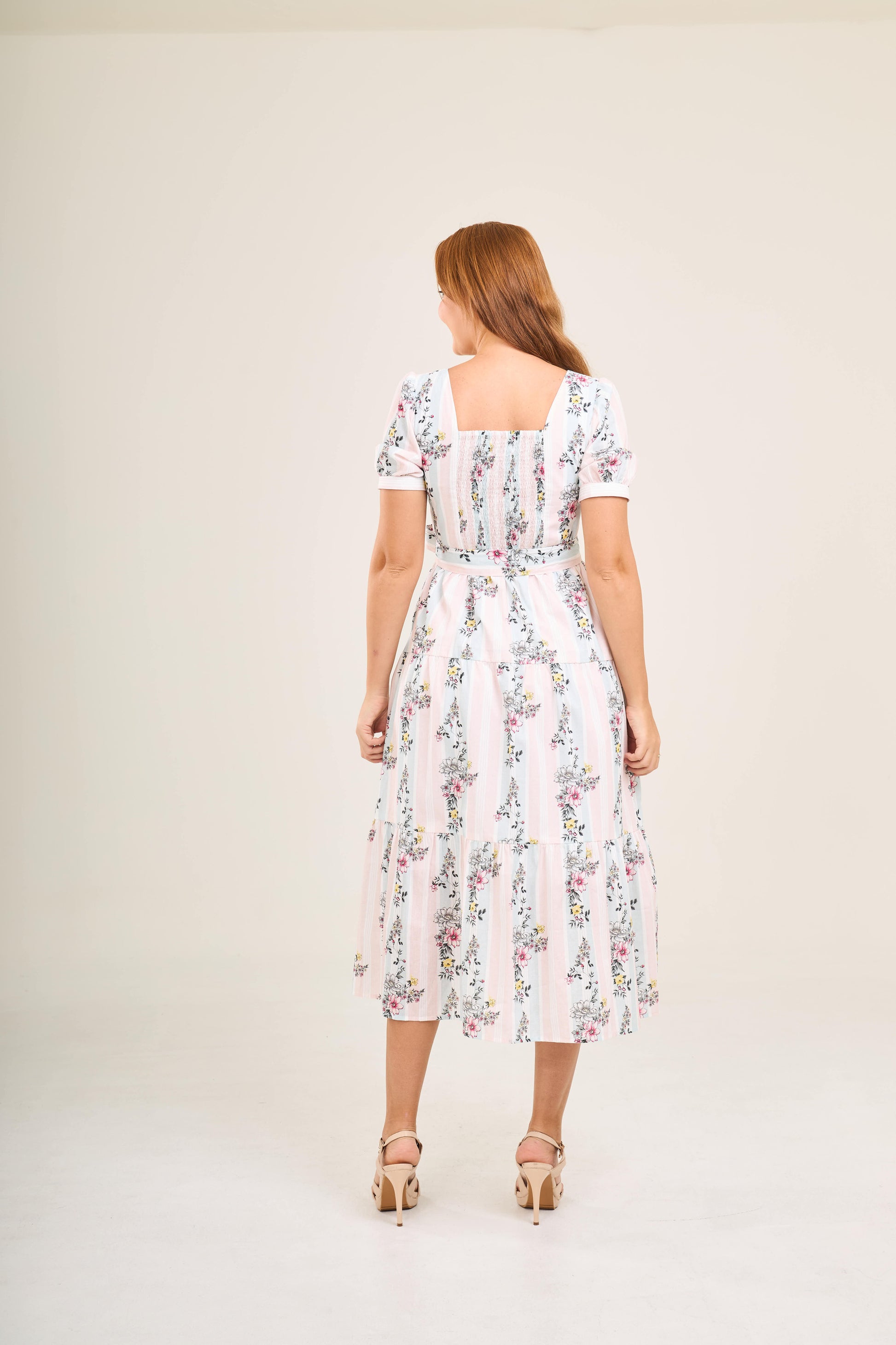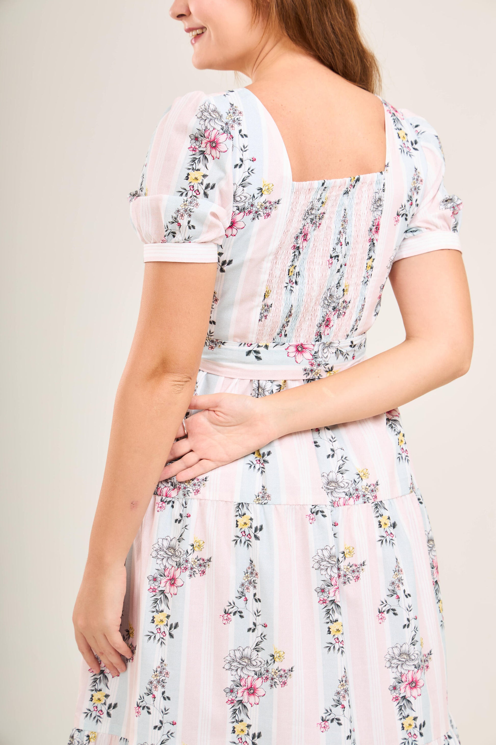 This graceful dress features a square neckline that discreetly conceals bra straps, a gathered skirt that enhances the silhouette, and a hand-smocked back with a 1-2 inch stretch for a flexible, flattering fit. The adjustable sash can be tied at the front or back, allowing you to customize your look.
