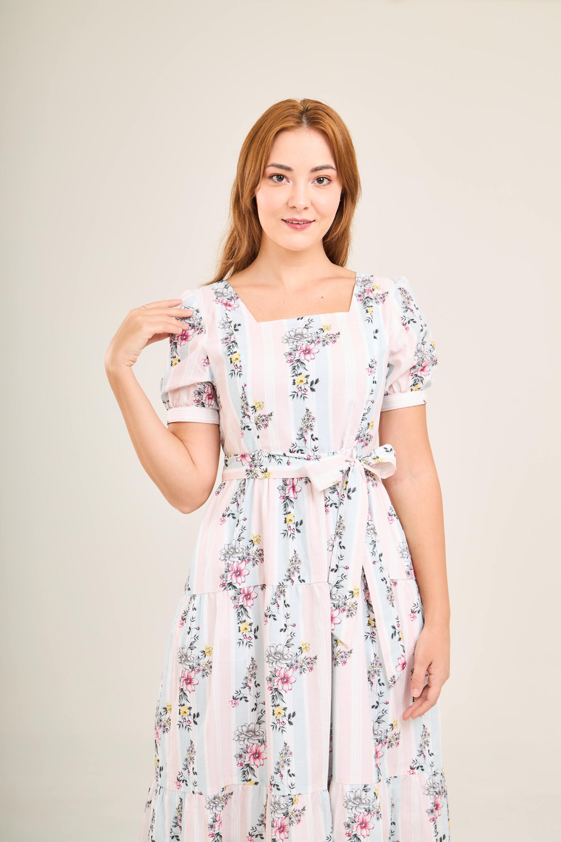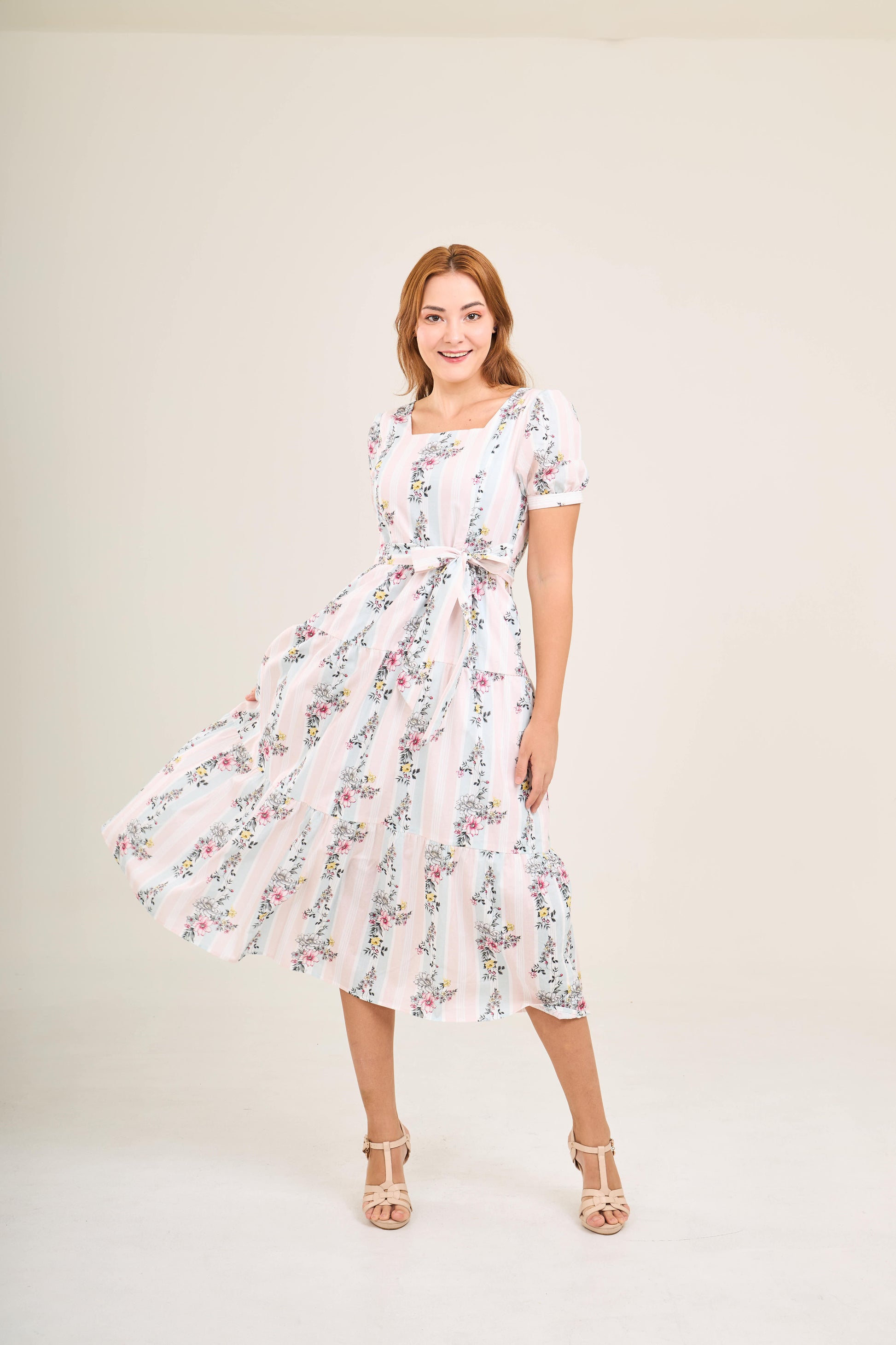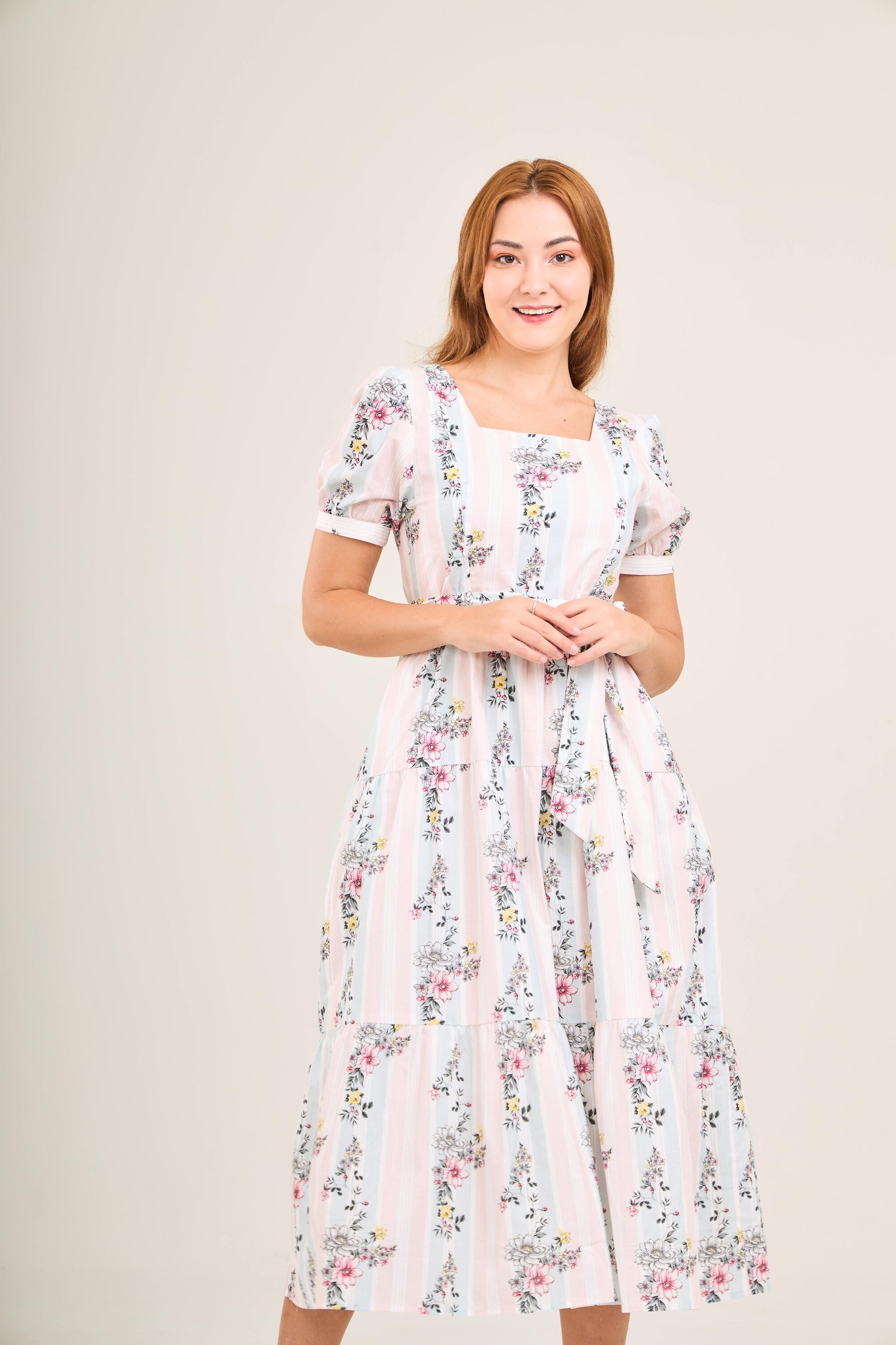 This graceful dress features a square neckline that discreetly conceals bra straps, a gathered skirt that enhances the silhouette, and a hand-smocked back with a 1-2 inch stretch for a flexible, flattering fit. The adjustable sash can be tied at the front or back, allowing you to customize your look.