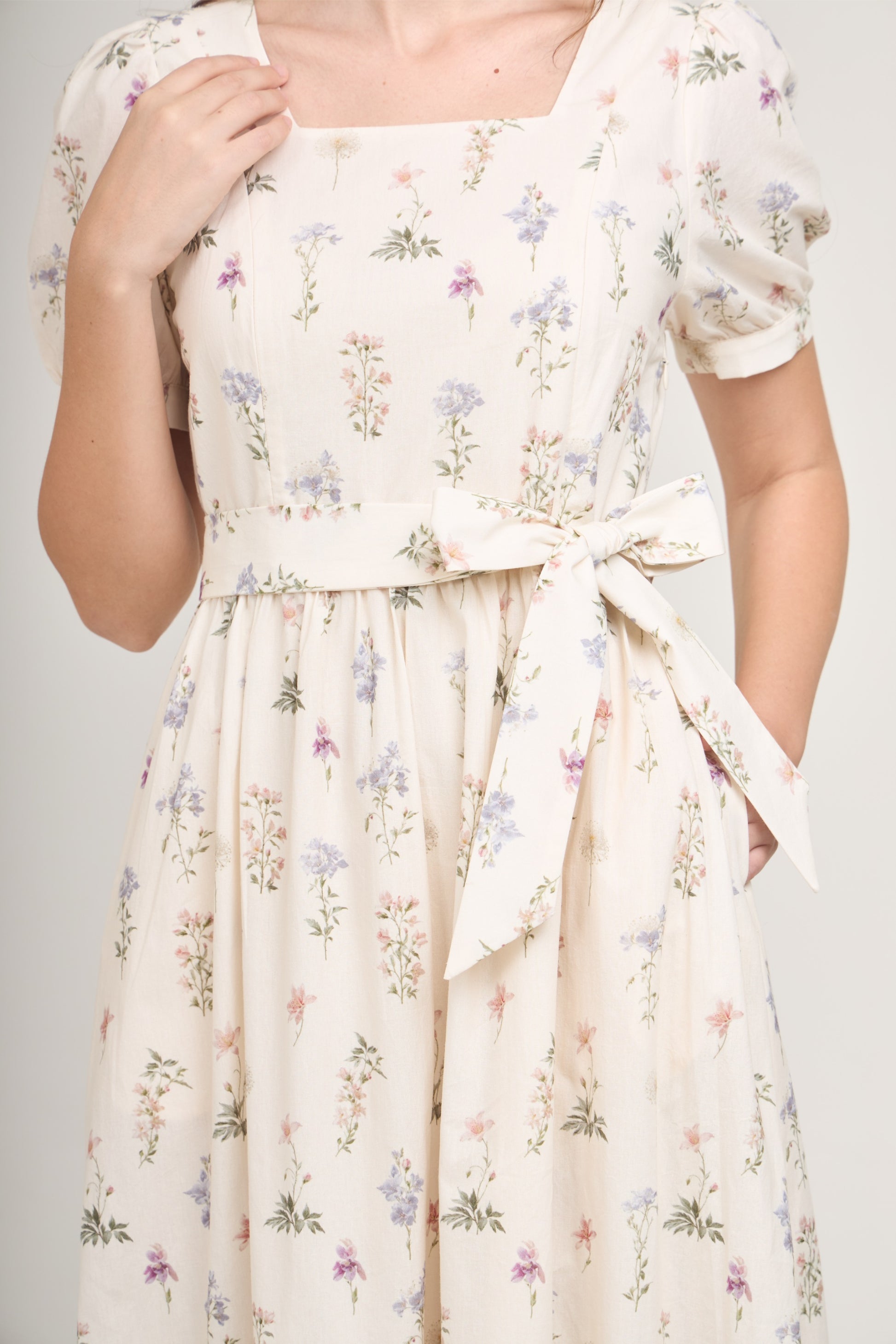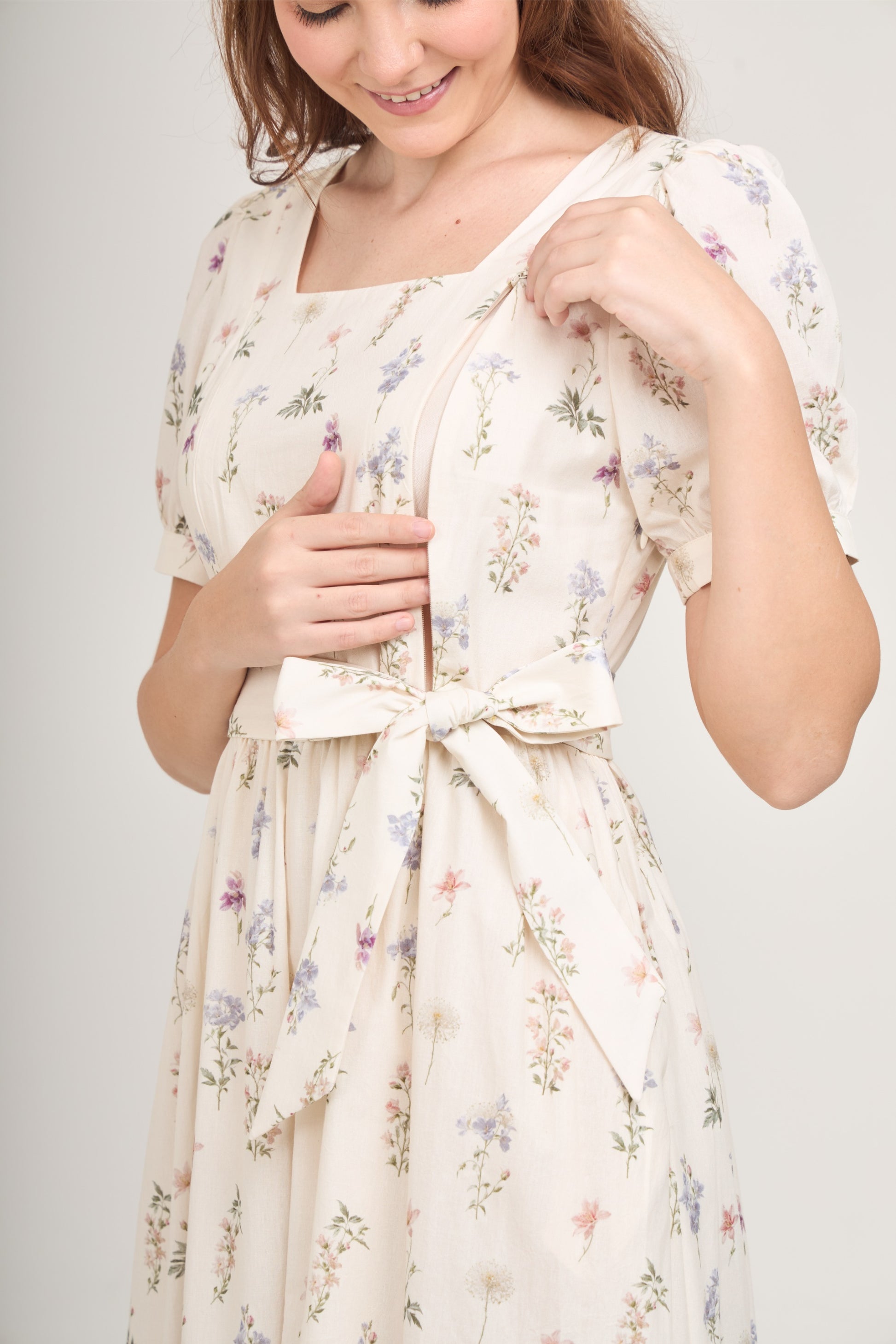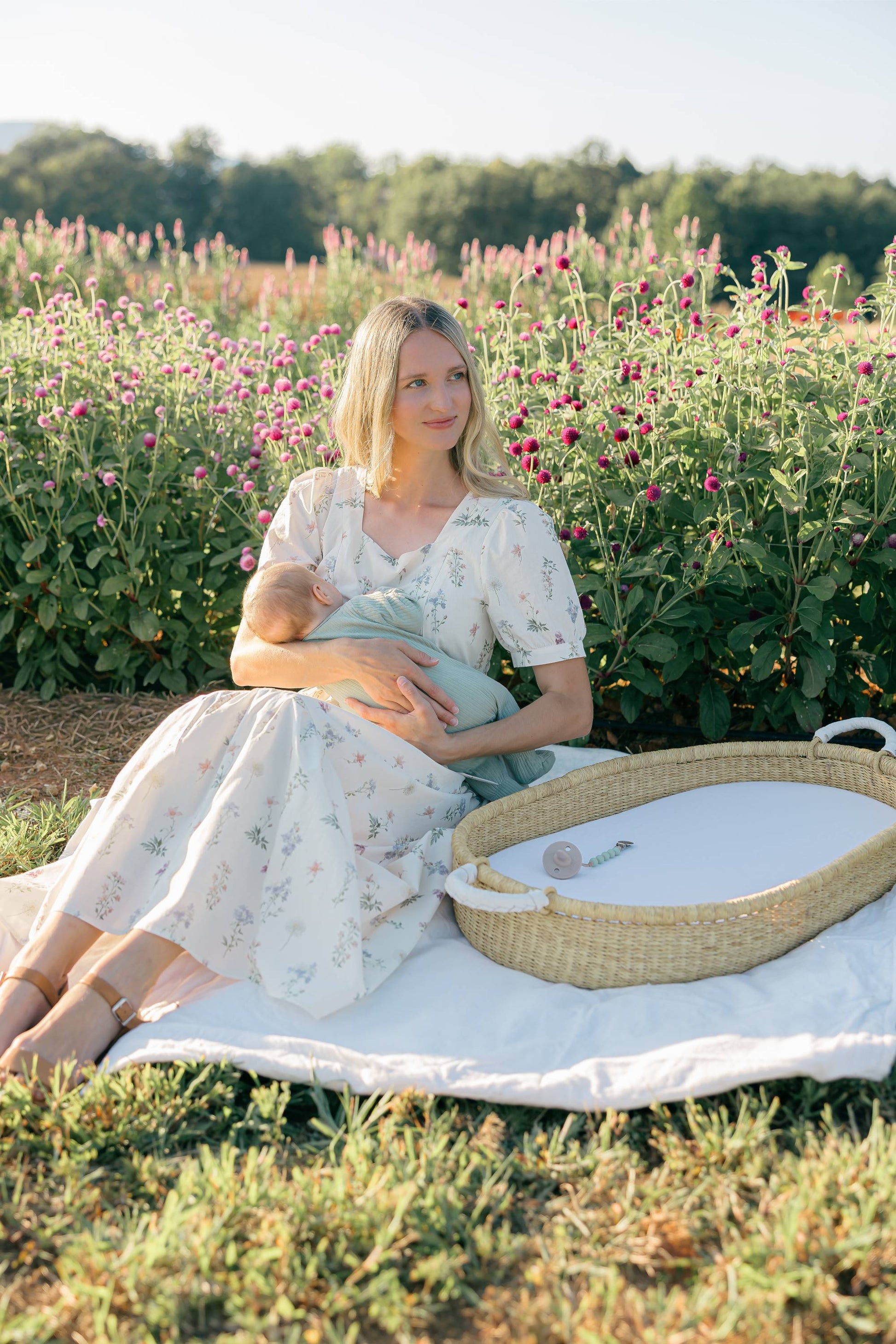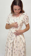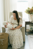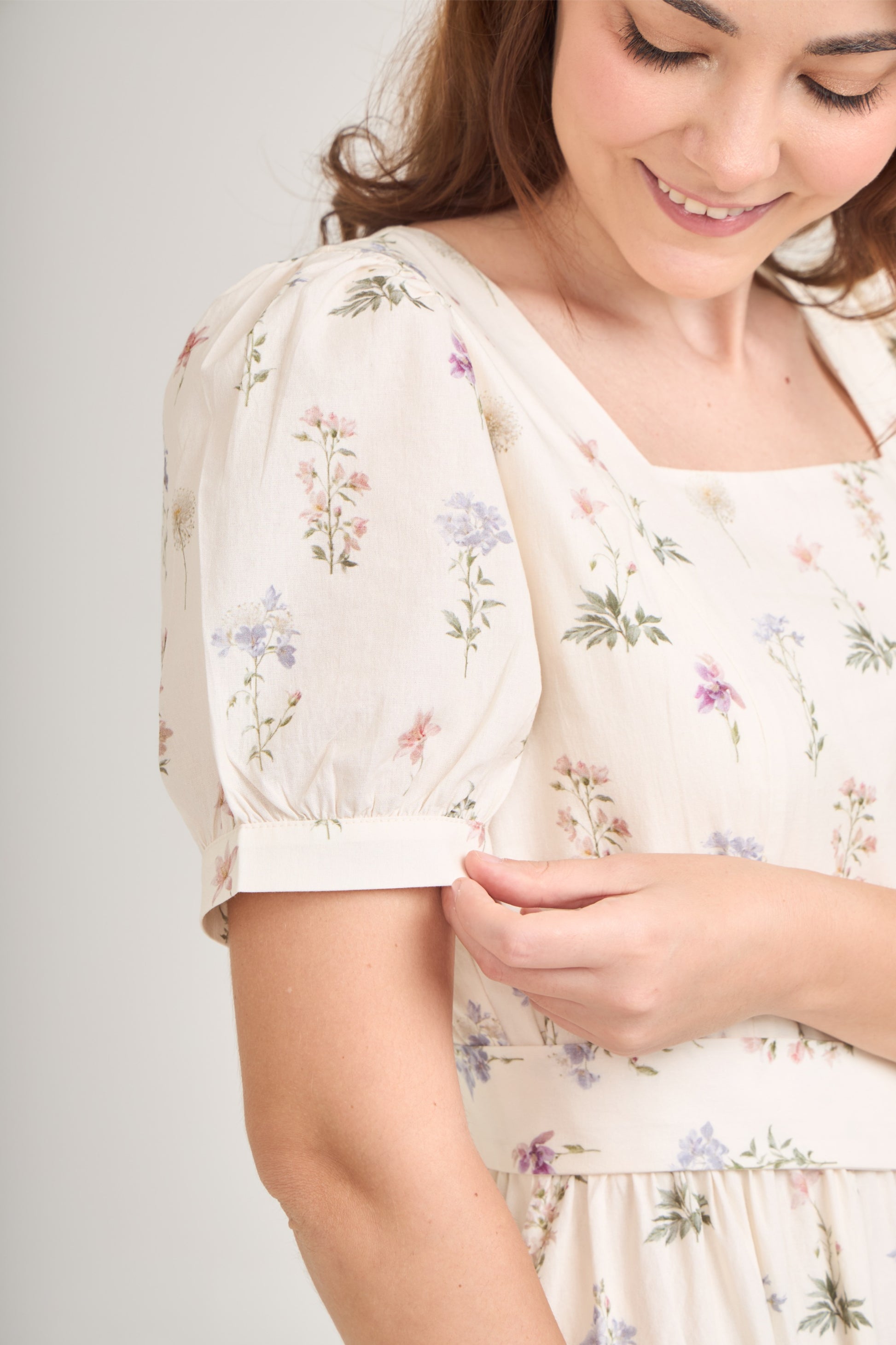 Meet the dress designed to celebrate you. The Versa Maxi Dress with Nursing Zippers in Evergarden is a timeless and graceful piece featuring pastel flowers, including lilacs, pink blooms, and airy dandelions that bloom gently across the fabric. A celebration of motherhood in every detail, this dress brings the soft charm of a blooming garden to your wardrobe.