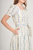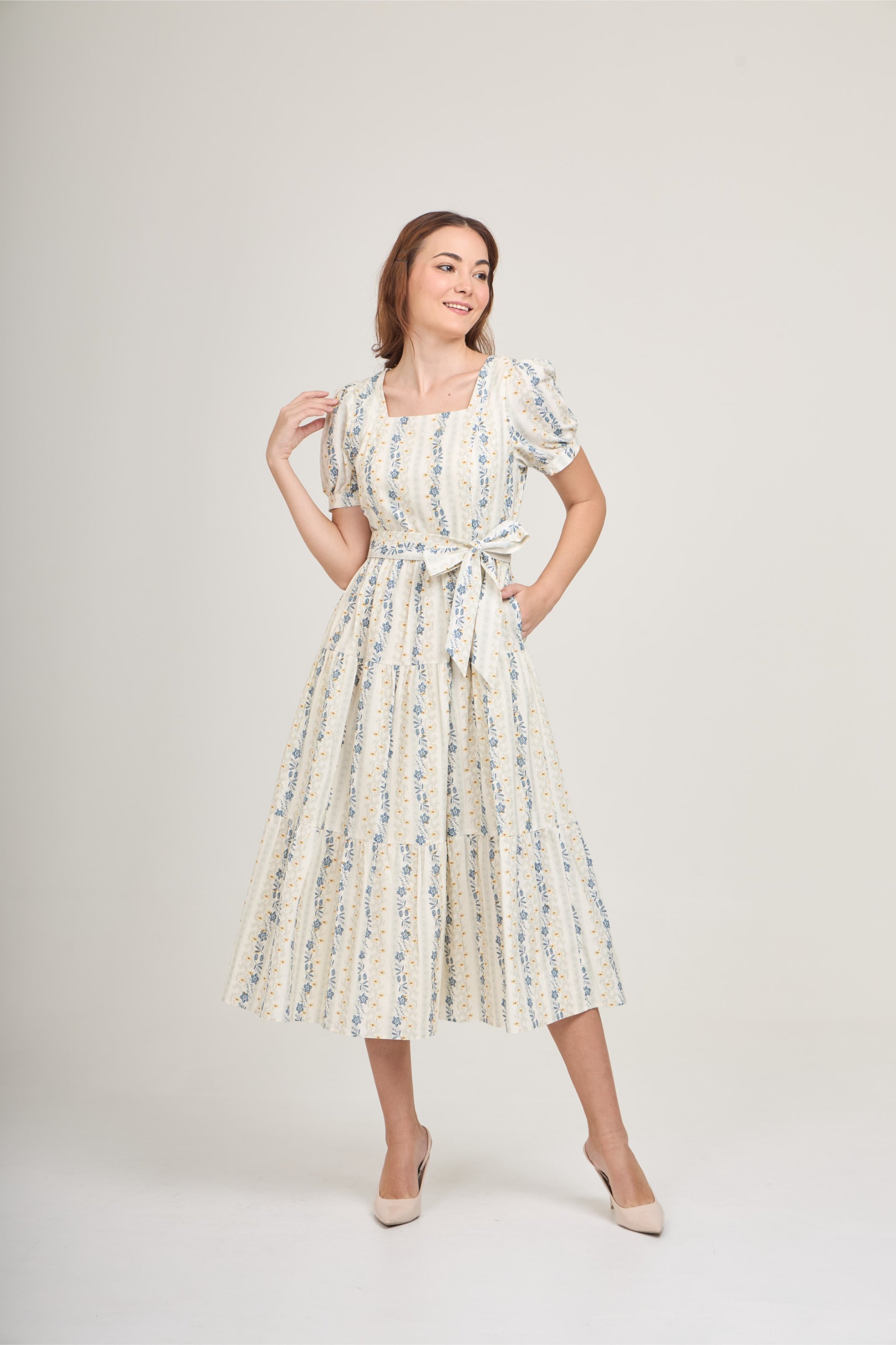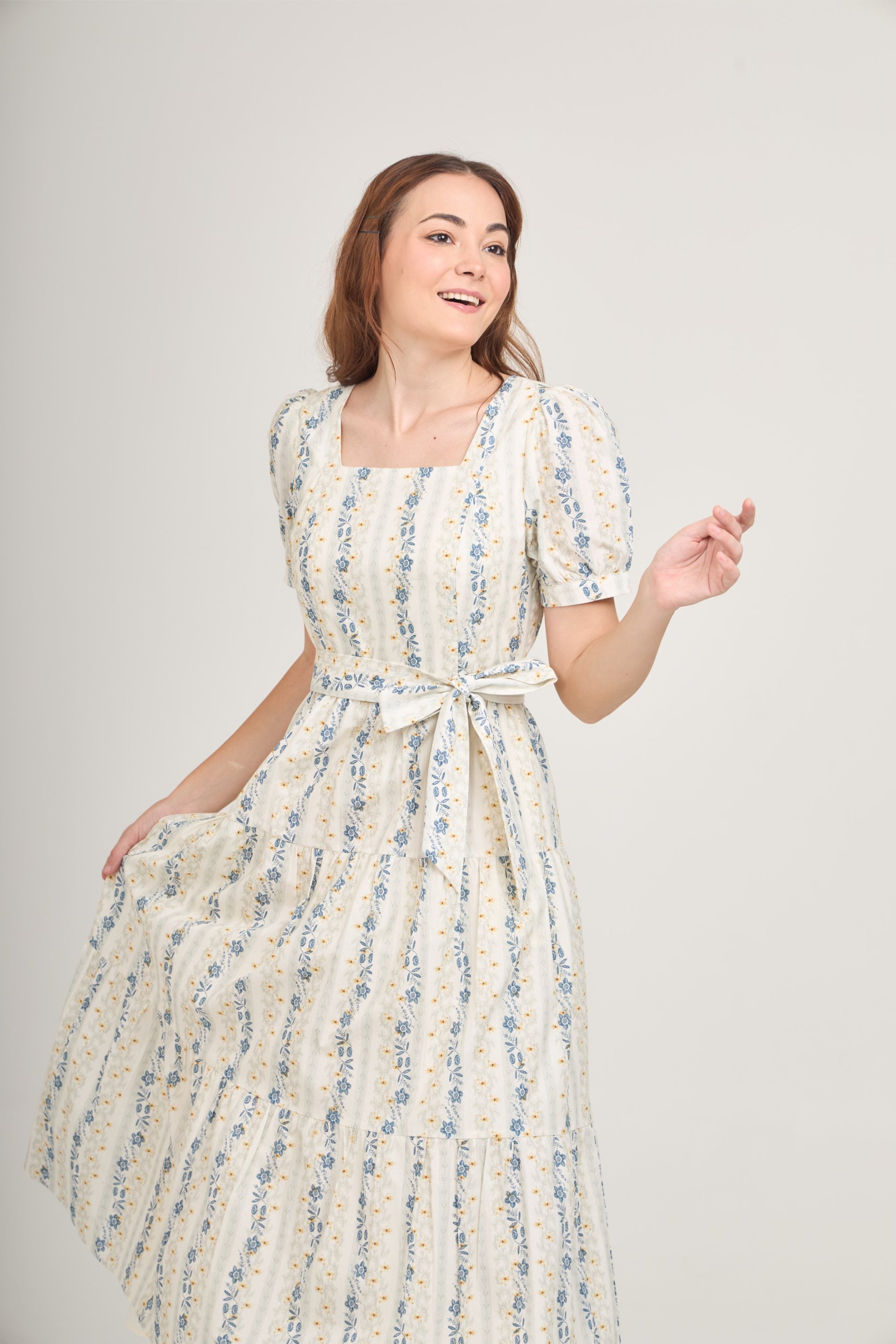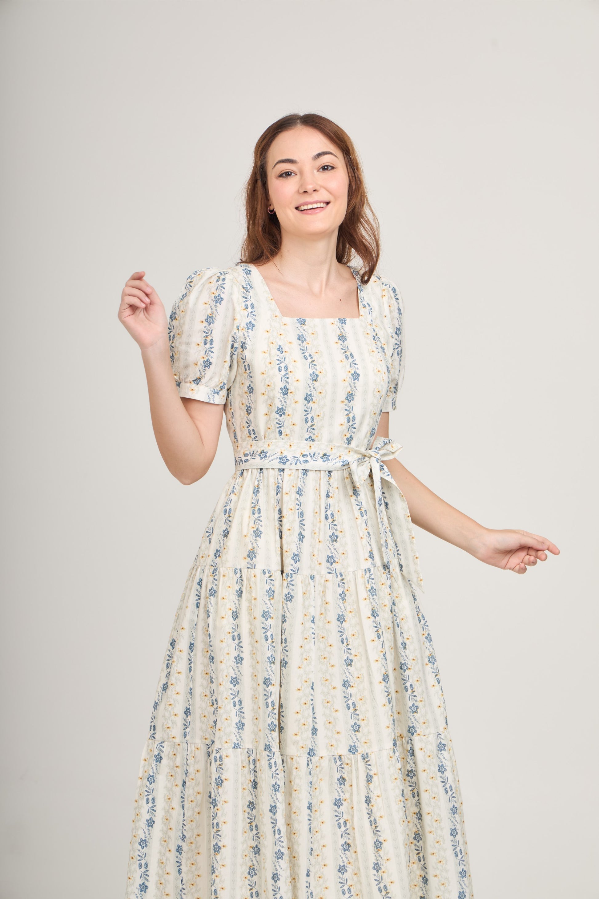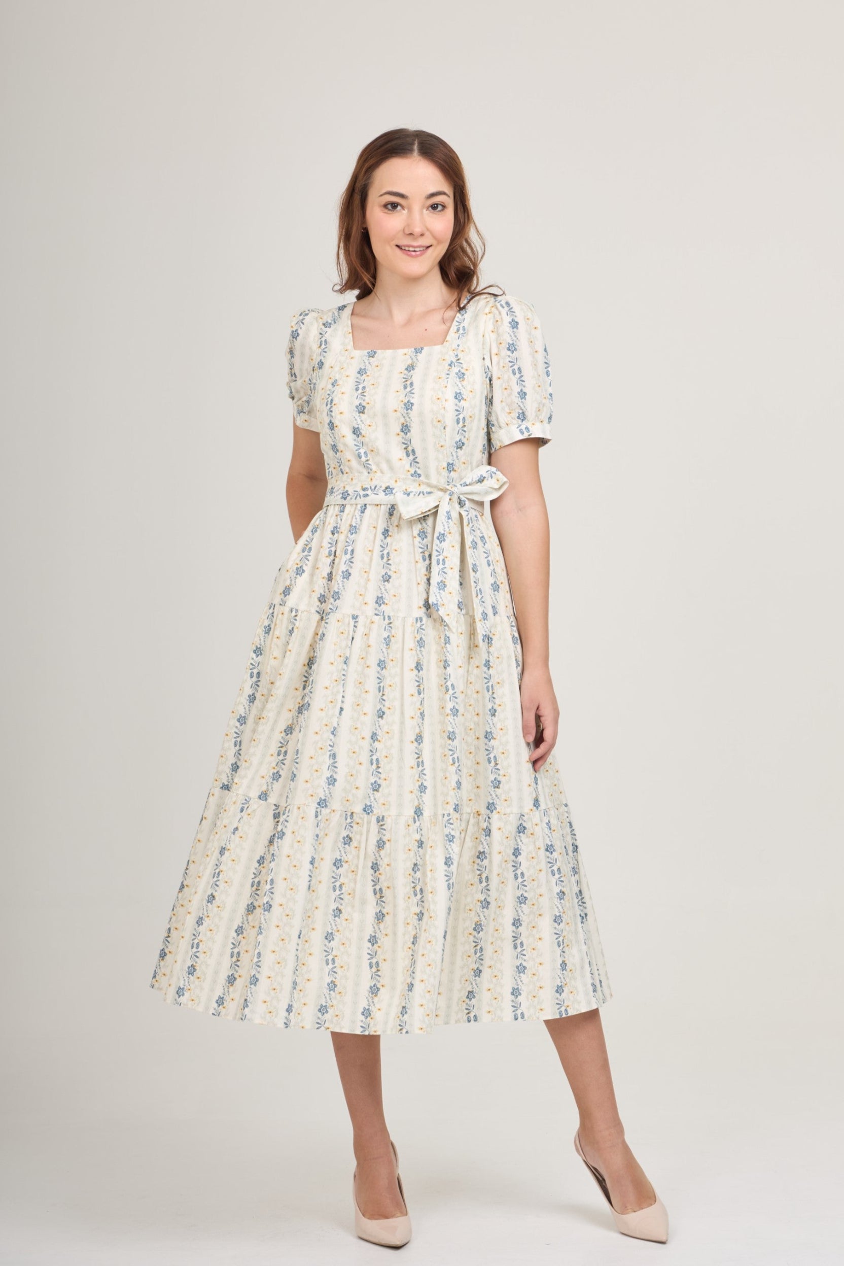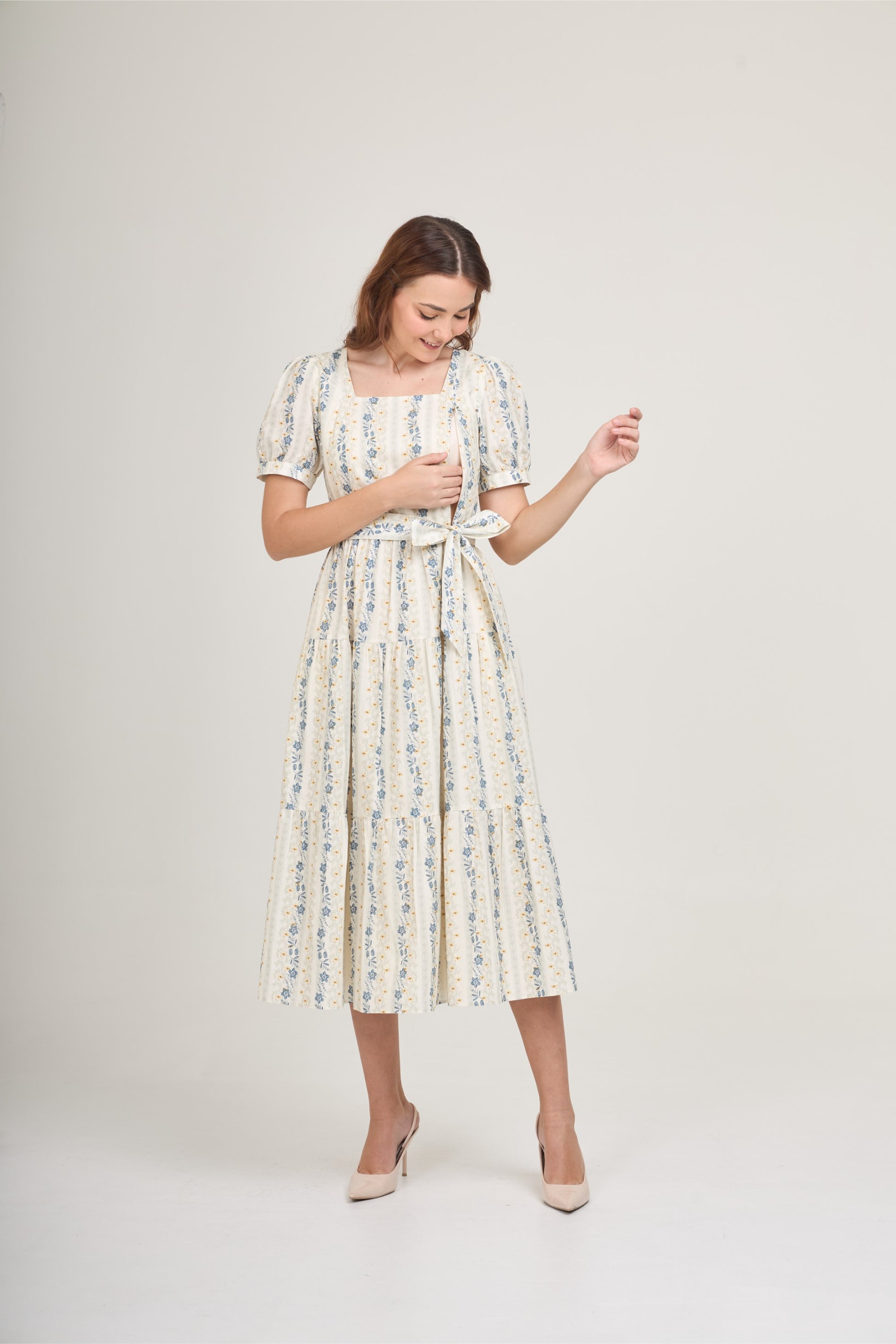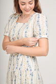 Presenting the elegant Versa Midi Dress with Nursing Zippers in Floral Trail, a timeless piece adorned with a delicate trail of soft golden blossoms and classic blue floral accents that flow with gentle sophistication. Designed to celebrate motherhood beautifully, this dress becomes a cherished addition to your Mome collection.