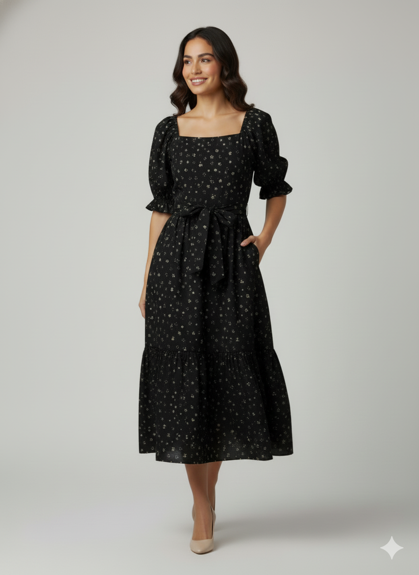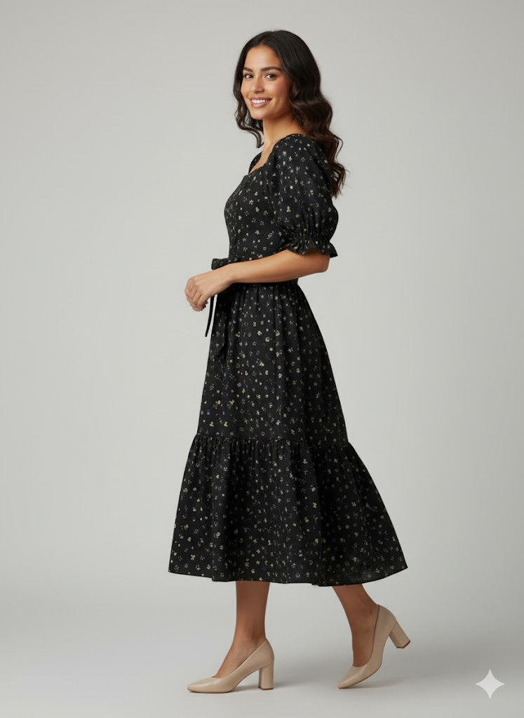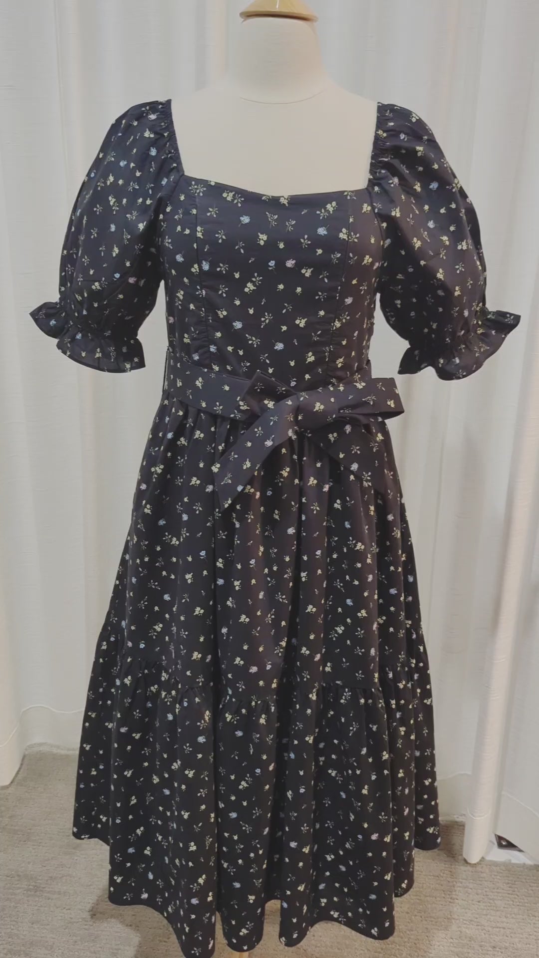 This timeless piece brings together everything you love about the Ann silhouette -- the puff sleeves, sweetheart neckline, and flattering gathered skirt, now reimagined in an elegant black base adorned with dainty scattered florals. It’s a look that feels effortlessly romantic yet refined.