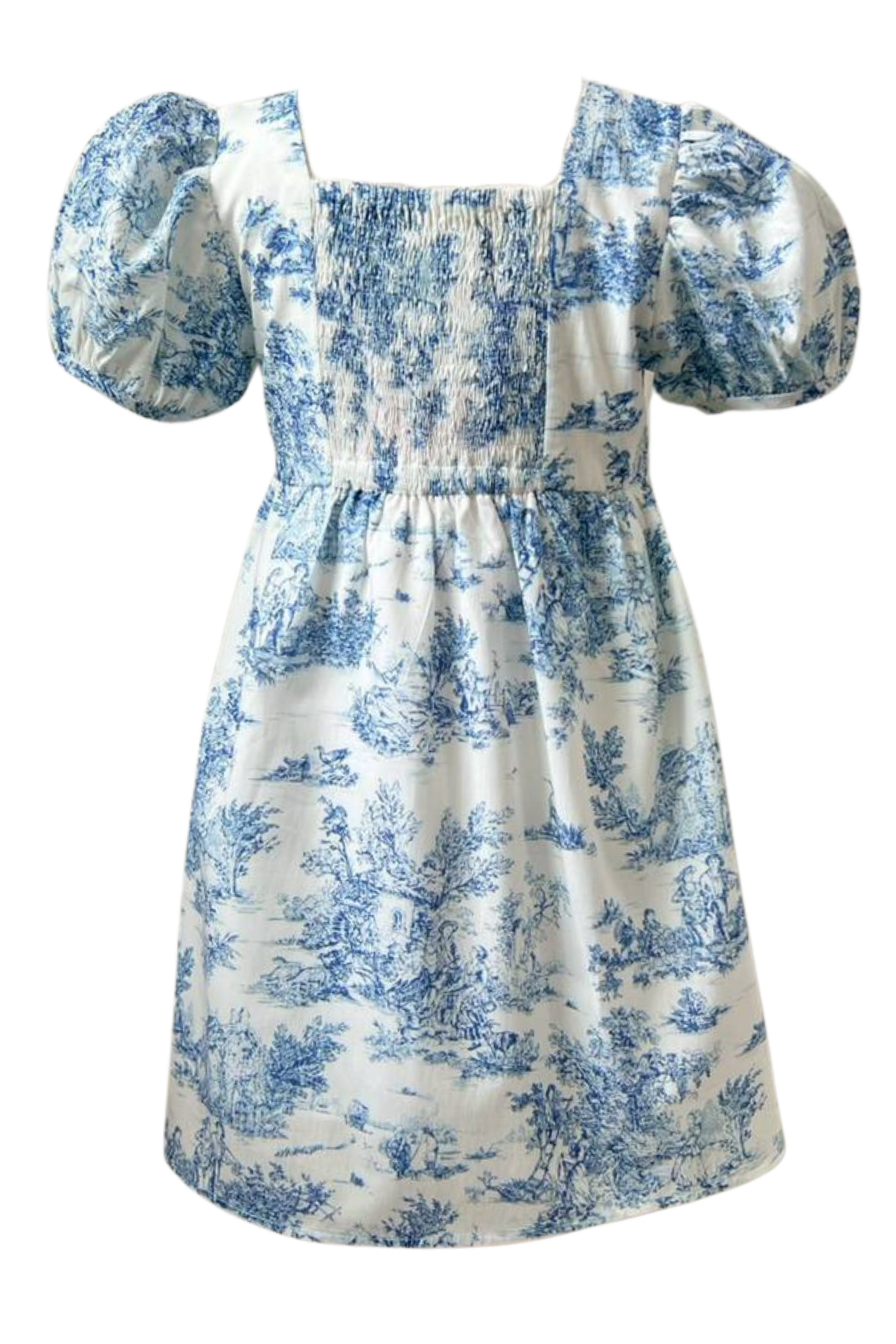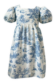 Little Darling Puff Sleeve Dress for Girls in Vintage Blue Toile