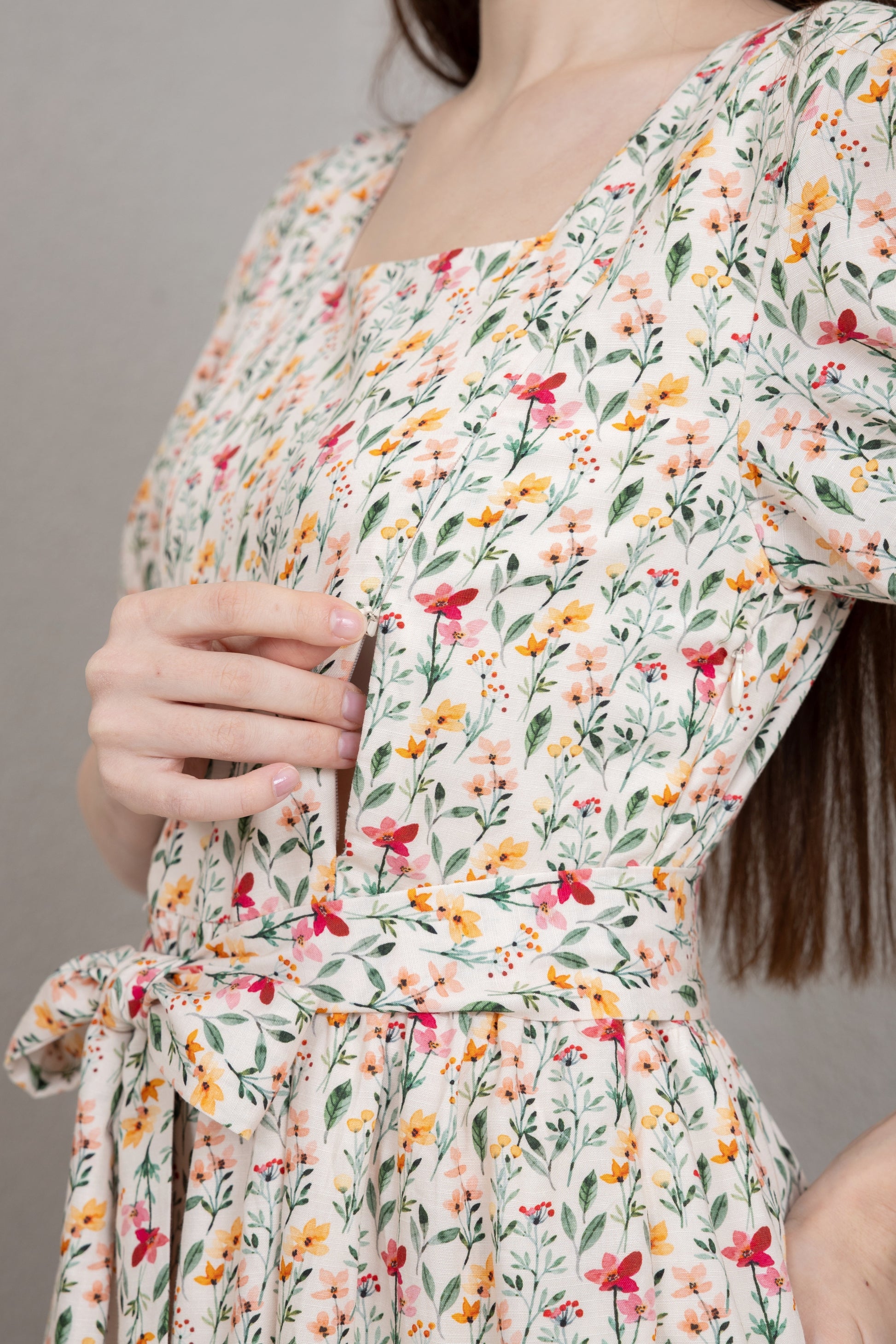 This dress features hidden YKK nursing zippers, the highest quality zippers ensuring easy and smooth zipping! They allow you to effortlessly feed your baby on the go. Plus!, you can still wear the dress after you are done breastfeeding because the zippers were thoughtfully designed and disguised as bust darts, so no one ever notices you are wearing a nursing dress.